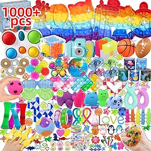 • 【PRODUCTS INCLUDE】Such as Animal fidget poppers(Dinosaur,Elephant,Turtle,Cat,Puppy,Giraffe),mini fidget keychain toys,fidget tubes*4,pop bracelet*2,butterfly poppers*1,pop fidget spinner*1,mochi squishy*4,sensory rings*5,chains*10,puzzle ball*4,sticky hands*2,squishies ball*1,building blocks*100,maze*1,tumblers*5,stickers*100,pull back car*5,time hourglass*1,jumping frog*20,fidget snake cube*2,slap bracelet*5,stretchy string*6,fidget spinners soccer ball*2,spinning top*50,spiky ball*10,etc