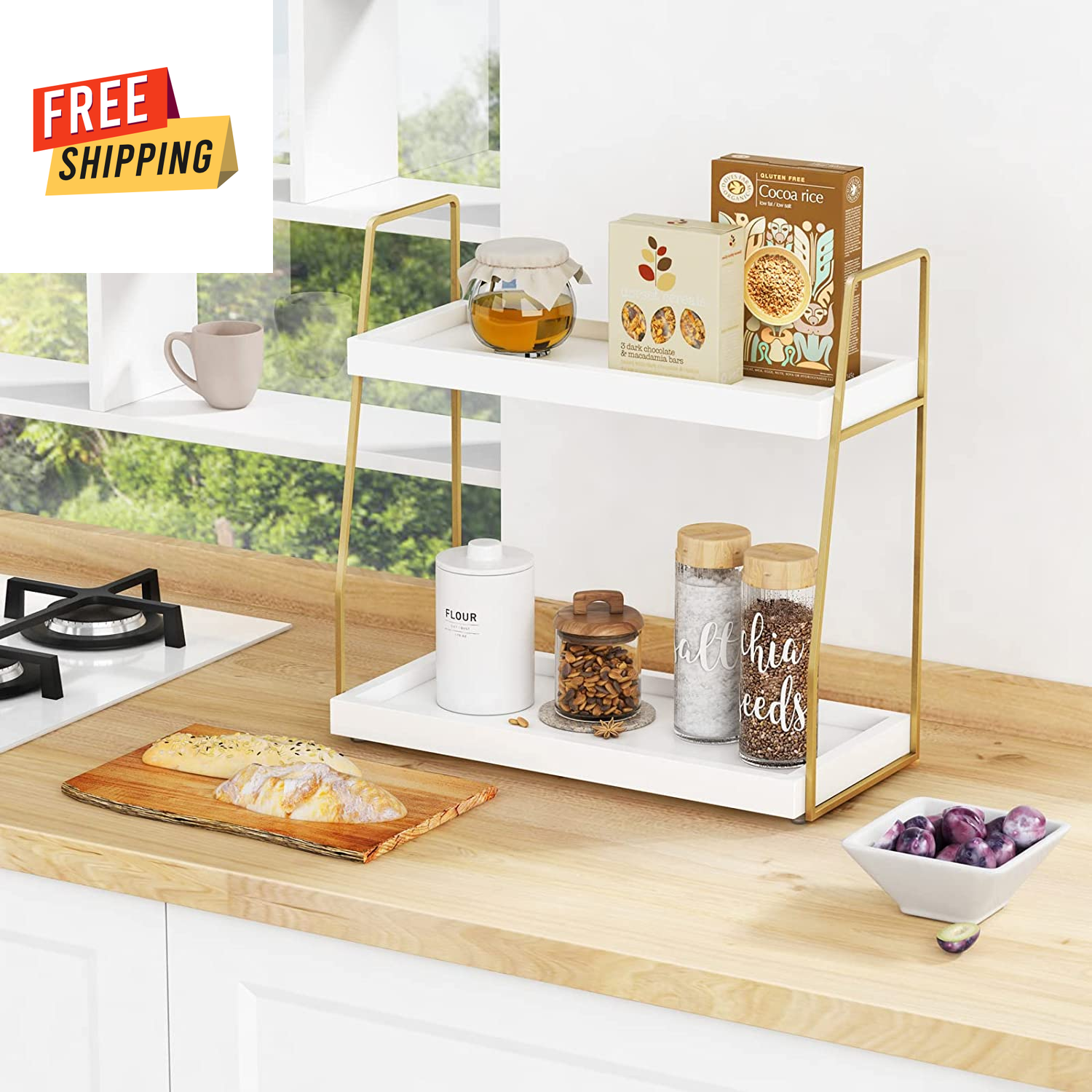 2-Tier White and Gold Bathroom Organizer Countertop - Wooden Sink Organizer Shel
