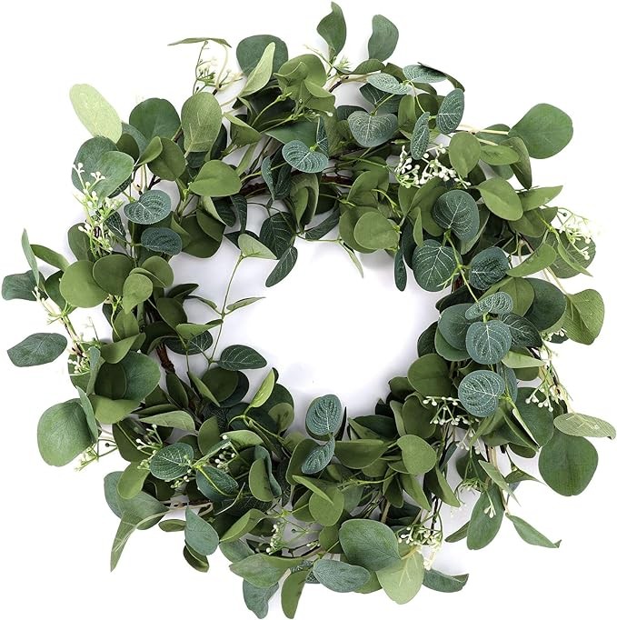 • Brighten up your house: the 20 inch hanging wreath is beautifully crafted with artificial eucalyptus for an elegant modern farmhouse look, looks lifelike, can always keep fresh and stay in green for a long time, you can use it to decorate home, parties, carnival, living room, bedroom, office, home, wedding, or other important festivals, which will create a pleasant atmosphere for these places