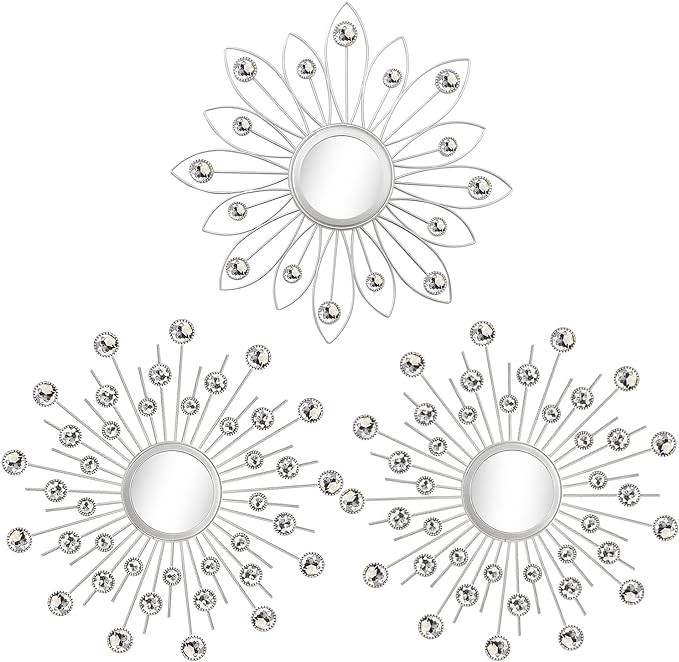 【CAPTIVATING FIND ON WALL】PACK OF 3. Measuring at 13.5" Diameter with silver metal frame and 4" Diameter for the mirror alone. These metal artpieces work great alone, or as a set with other multiple matching wall decors.