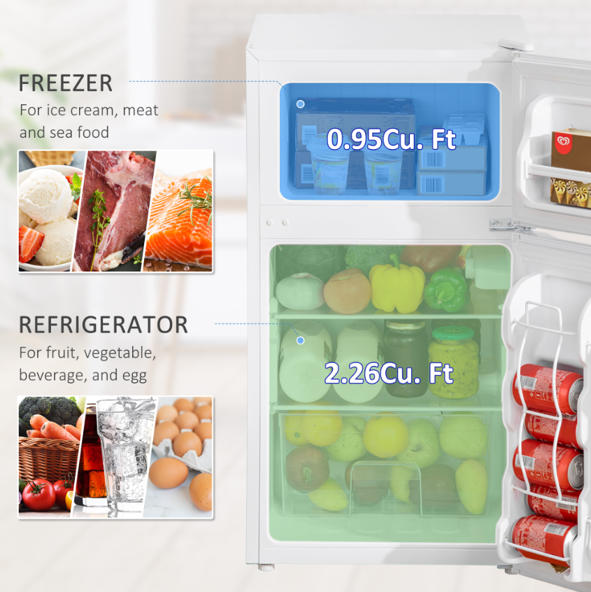 Whether you are looking for a mini fridge for your apartment, motor home, dormitory, office? Why not choose a portable mini compressor refrigerator from HOMCOM? Features 2 zones: refrigerator and freezer, allow you to keep various food like drinks, vegetables, ice cream and more. And with a thermostat to adjust the temperature. Considerate design like reversible door, interior light and adjustable feet provide more convenience. Don't hesitate and take it home!