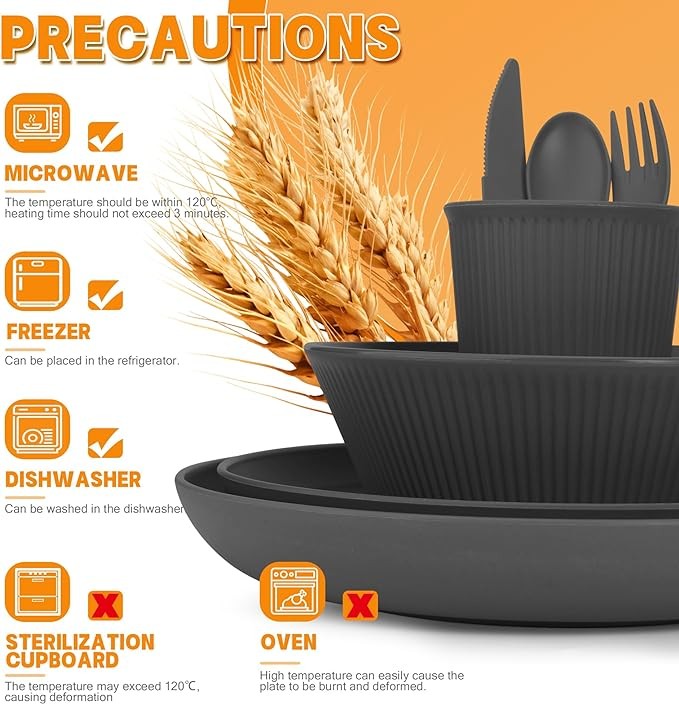 • ? DISHWASHER & MICROWAVE SAFE: Our premium quality wheat straw dinnerware sets are safe for use in the microwave and dishwasher. They are easy to use, clean and store. Note: The temperature resistance reaches up to 248 degrees Fahrenheit (120℃).