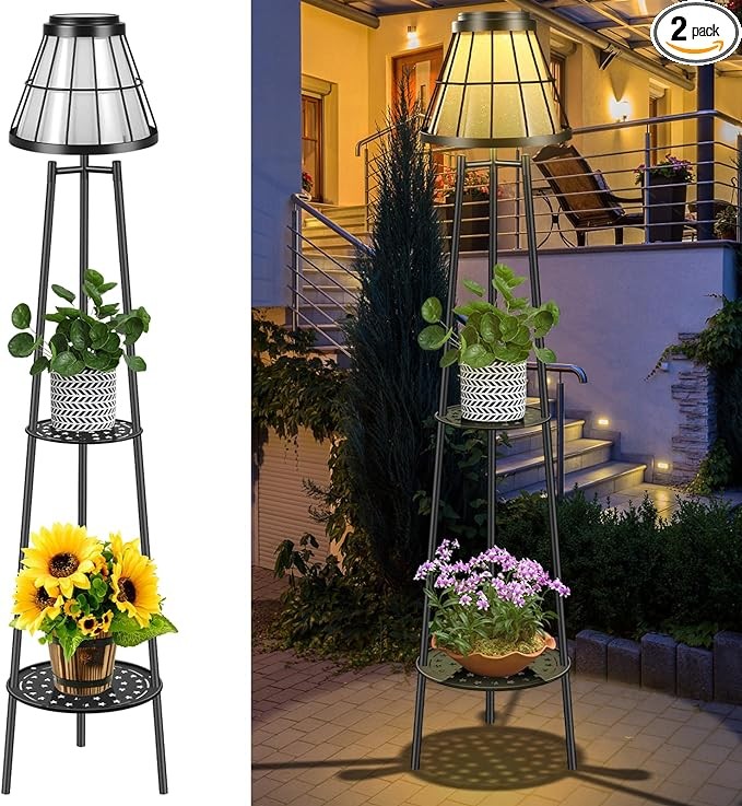 • ☀【UPGRADED SOLAR FLOOR LAMP】Unlike other solar floor lamp that only have one layer of plant shelves or none, our upgraded 45.5" lights features a double layer of plant shelves, so you can put your favorite flowers or books on the shelves. then place solar lamp on patio, porch, deck, garden to add beautiful. The style is modern and simple, compact and delicate. landscape lighting to creates a romantic atmosphere for your home. Extremely pretty solar powered outdoor