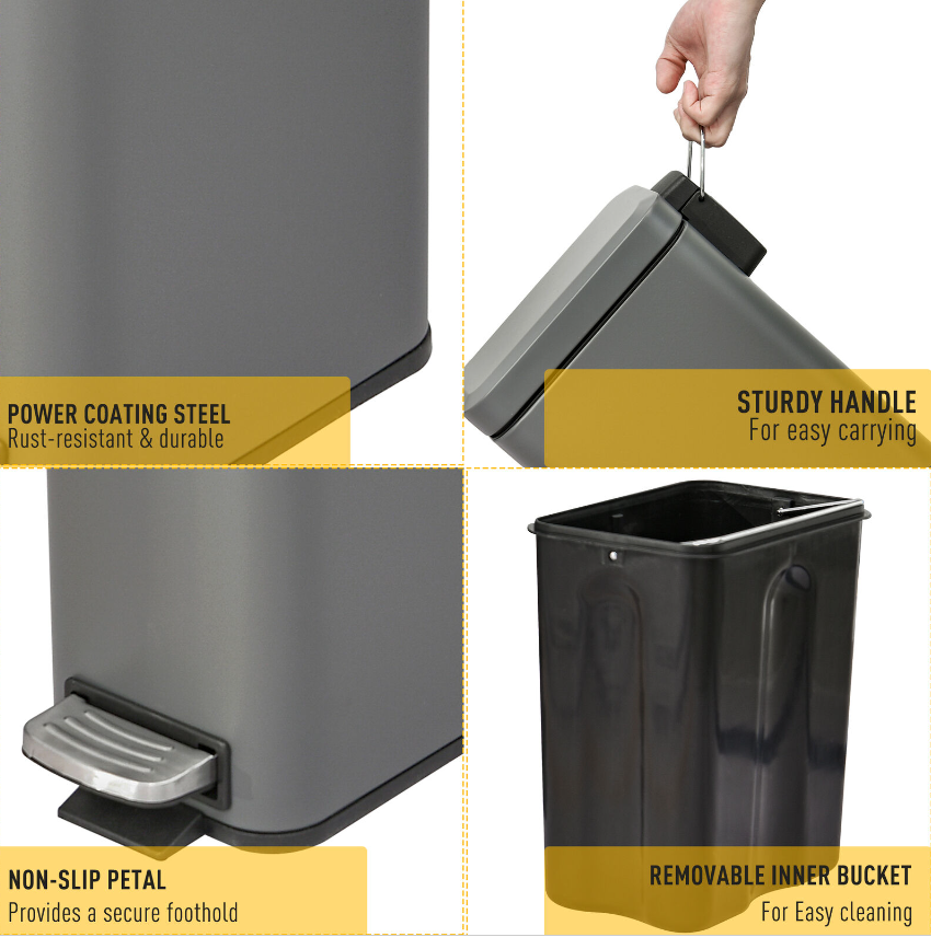 • Made from bedrooms, offices, bathrooms and beyond, this compact and stylish rectangular bin will ensure your home is never left untidy again. Using steel for a body which is tough and tactile, it is covered with a power coating to ensure extra strength and resilience in a fresh color hue for beauty and versatility. Five litres in capacity to provide plenty of holding room, it is fitted with an inner removable bucket for easy cleaning, a handle for hygienic lifting and non-slip bottom to keep it in place. The soft and quiet-close lid works together with the large foot pedal for fuss-free opening and closing.