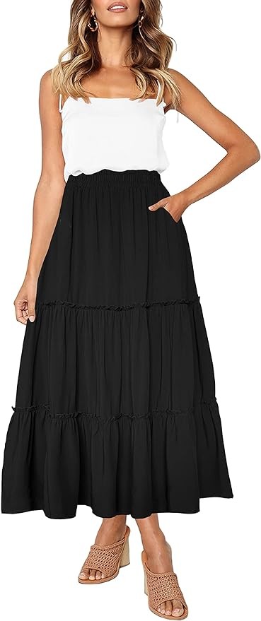 Maxi skirts for women length, bohemian style, solid color, casual loose fit, long flowy skirts ankle or full length, High elastic waist for the perfect fit. Two side pockets for convenient