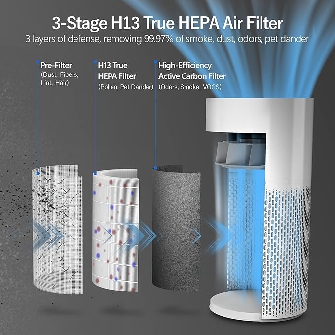 • [HIGH PERFORMANCE] 3-Stage filters, the air through pre-filtration, HEPA filtration and activated carbon filtration 3 levels filters, it can capture 99.97% of 0.3 micron air particles, such as dust, dander, smoke, pollen and odor; H13 level filter; 100-240V Voltage ,output 24V 1.5A
