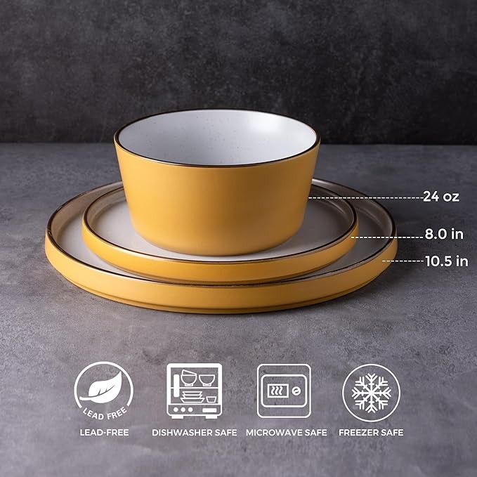 AmorArc Dinnerware Sets of 4, Modern Stoneware Plates and Bowls Sets,Chip and Crack Resistant | Dishwasher & Microwave Safe Ceramic Dishes Set,Service for 4 (12pc)-Speckled & Matte Yellow