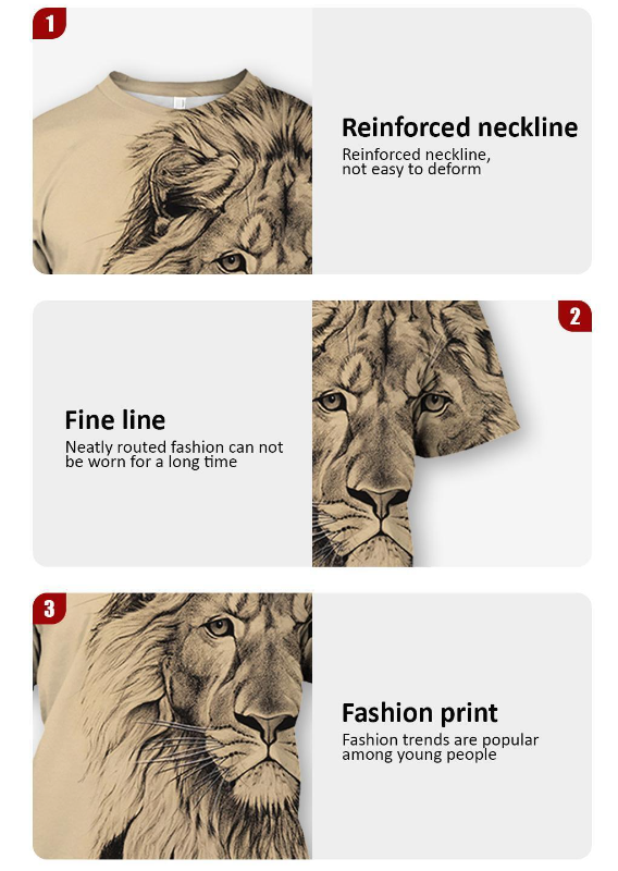 Introducing this captivating men's 3D printed t-shirt, a must-have addition to your summer wardrobe for embracing the wild and bold fashion. The lifelike 3D printed image of an animal lion makes this t-shirt stand out, adding a unique and daring statement to your summer outfits.