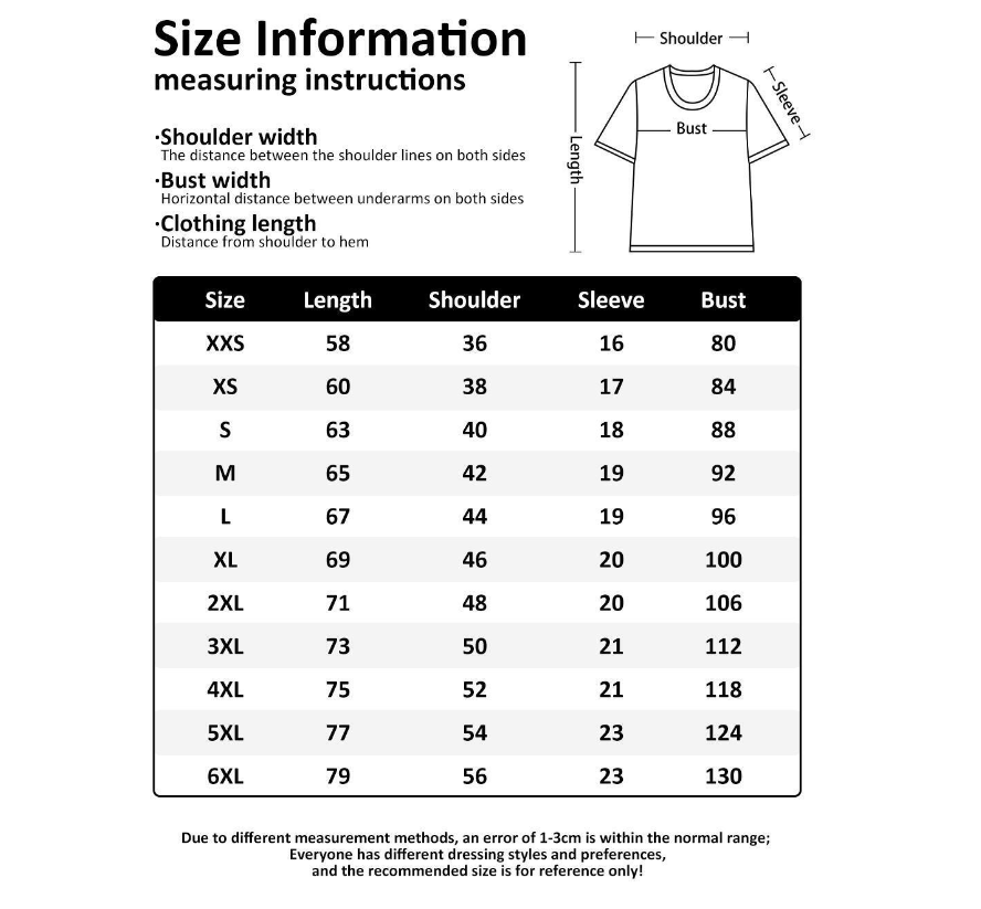 • Available sizes: S, M, L, XL, 2XL, 3XL, 4XL, 5XL, 6XL
