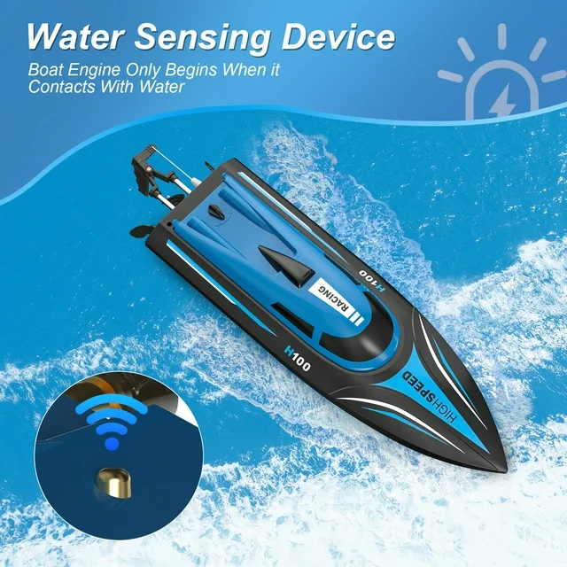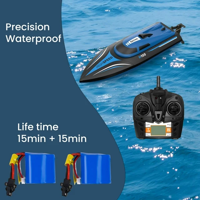 High-speed Remote Control Boat: H100 RC boat for adults and kids races across the water at up to 20 mph. This high-speed boat submarine toy is equipped with a 4-channel 2.4 GHz remote with a 150-meter signal range.