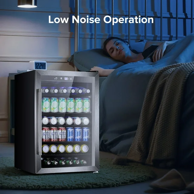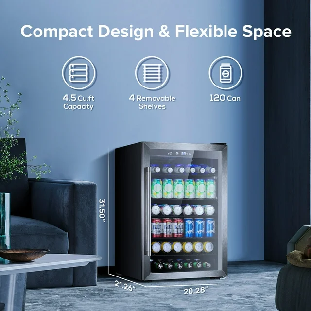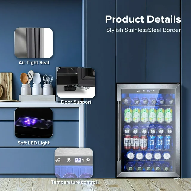 • PERFECT CAPACITY:Auseo 4.4 Cu. Ft. The beverage Refrigerator features an elegant see-through, left hinge glass front door with a stainless steel frame for you to view your wine, beer, or soda at a glance. With its reinforced glass door with an airtight seal and help to maintain an ideal humidity level, this beverage refrigerator gives you a compact and modern design. Blue soft LED interior lighting not only beautifully showcases the wine or drink but also won't damage the wine or drink.