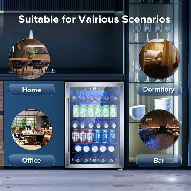 • COMPACT BEVERAGE COOLER: 20.5*21.3*31.4 inches mini refrigerator can keep a variety of canned drinks or wine chilled without taking up too much space at your home, dorm, bar, or office. It can conveniently hold 145 standard-sized drinks cans to impress your guests during parties, and this high-quality Beverage Refrigerator will surely fit and add an elegant accent to any home decor.