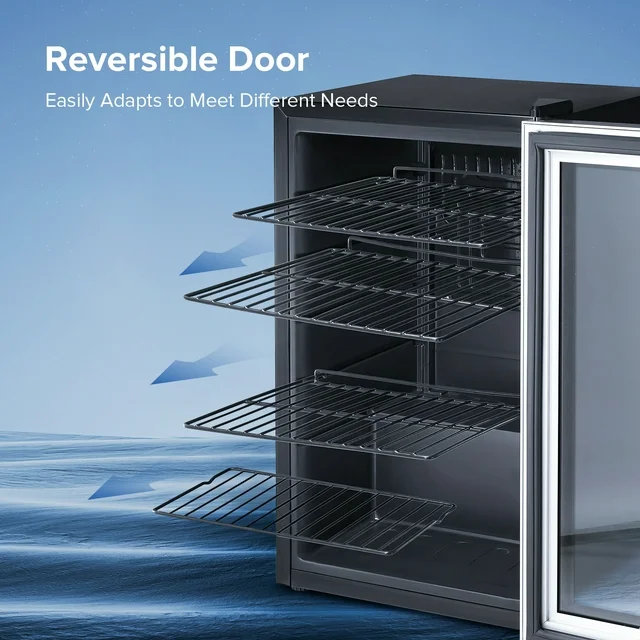 • NO VIBRATION and QUIET: Equipped with an advanced cooling system and a whisper-quiet compressor that works with a small convection fan to cool quickly, and keep consistent air circulation for a uniform temperature supply inside. Also equipped with Movable Black Shelves, Stainless Steel Glass Door, and Adjustable Leveling Legs. It is convenient for customers to move the position of the beverage cabinet, and they can drink cool drinks or wine anywhere.