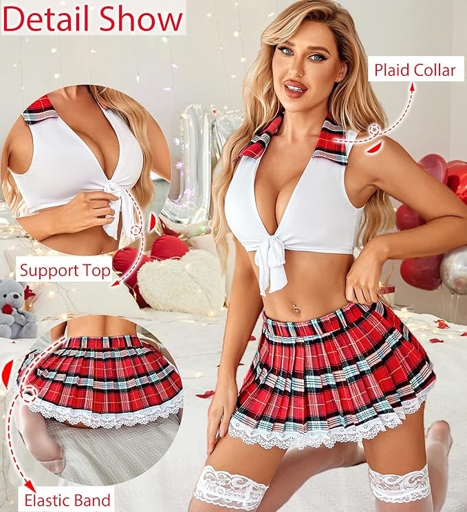 Avidlove Lingerie Set for Women Sexy Lace Two Piece Lingerie Outfits with Tie Top and Mini Pleated Skirt Set