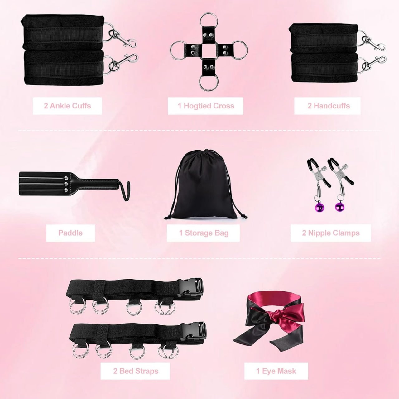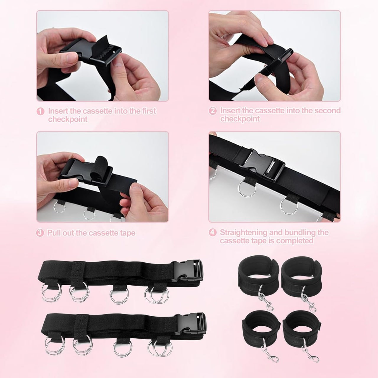 【Bed Restraints Bondage Set w 4 Cuffs】- This bdsm sex toy is an easy way to attach wrists to ankles that will help you to release your imagination of ideal sexual behavior. No matter what kind of role-play and posture you want it can help you to achieve. Soft cuffs with fastenings make light work of full-body bondage. Each cuff features a sturdy D-ring, which can you can feed the rope through or attach to other bondage items to create a full restraint system.