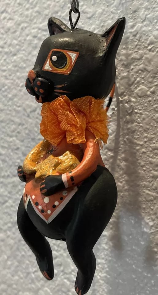This discontinued Leeann Kress for Bethany Lowe Halloween Moon & Stars Cat ornament is brand new. It has never been used or displayed and was unwrapped for these photos only. It has its original tag.