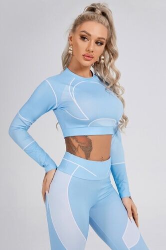 Blue 2 Piece Long Sleeve Fitted Graphic Yoga Gym Work Out Set For Women