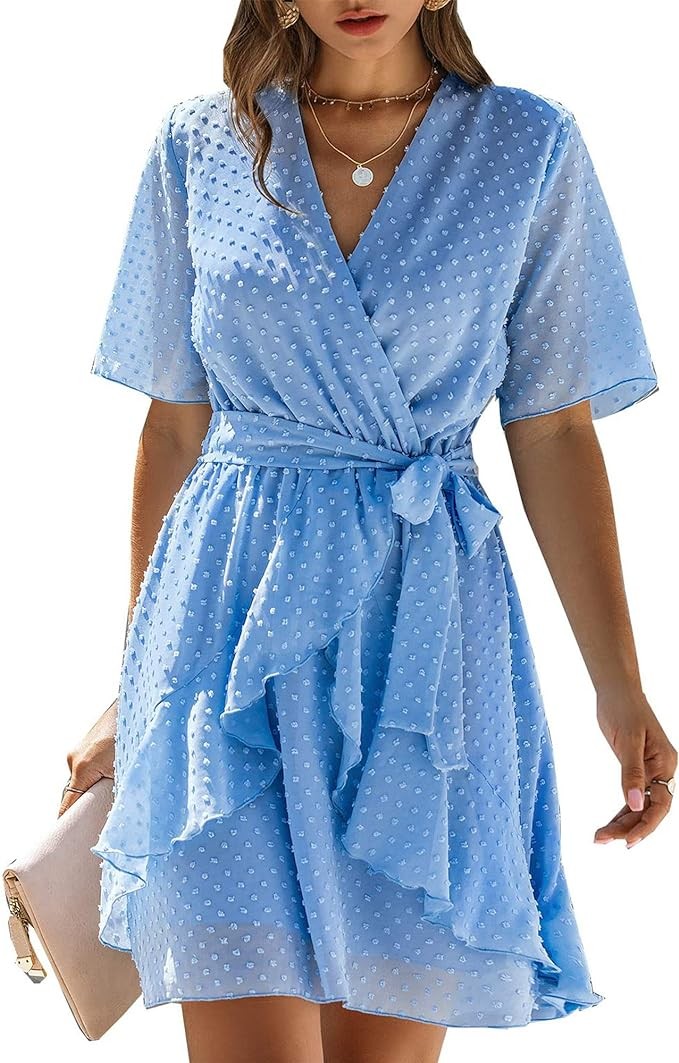 BTFBM Women 2023 Fashion Faux Wrap V-Neck Dresses Short Sleeve High Waist Belt Swing Ruffle Hem Aline Summer Short Dress