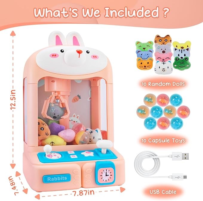 • What's Included: The mini claw machine comes with 10 cute plush toys and 10 capsule toys, and even features realistic music to create an authentic game atmosphere. Plus, you can adjust the volume or turn it off if you prefer. It's also perfect for use as a reward system to motivate kids.
