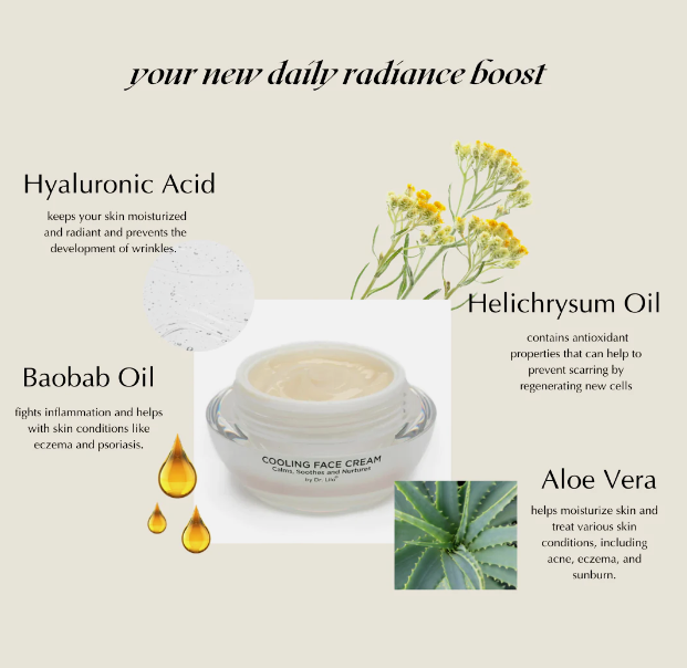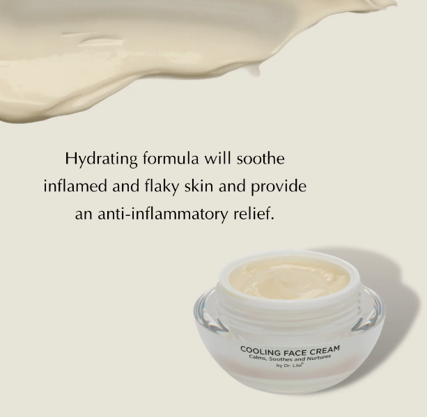 The Cooling Face Cream helps restore, nourish and rejuvenate healthy looking skin. This product has a hydrating formula with rose water, aloe vera, helichrysum extract, baobab protein, goji berry, and cranberry extracts. It moisturizes the skin for up to 48 hours and helps restore the skin's natural barrier. It also soothes inflamed and flaky skin and provides relief from inflammation.