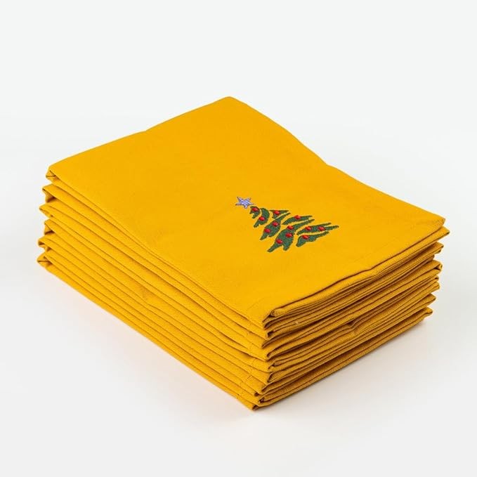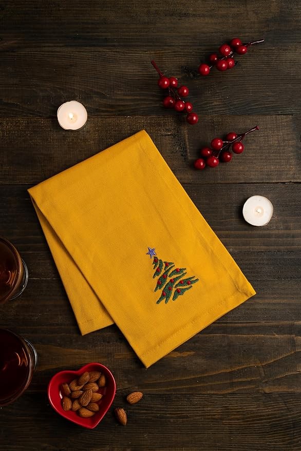Candy Cottons Christmas Napkins Cloth Napkins Yellow Dining Table Dinner Napkins| Washable Cotton Napkins Easter Basket Decor|Christmas Tree Embroidered 18x18 in Yellow Pk of 6 Cocktail Party Napkins
