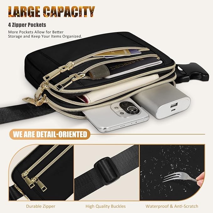 • 【Large capacity- 4 Zipper Pockets】Rummaging for your keys in a fanny pack pocket full of stuff can be maddening. More pockets for better storage, helping you find what you want faster.2 Roomy main compartments with space for all your stuff, including 2 mesh slots to keep your item neat and organized.2 zippered front bags can be used to store keys and cards without worrying about the keys scratching your phone.
