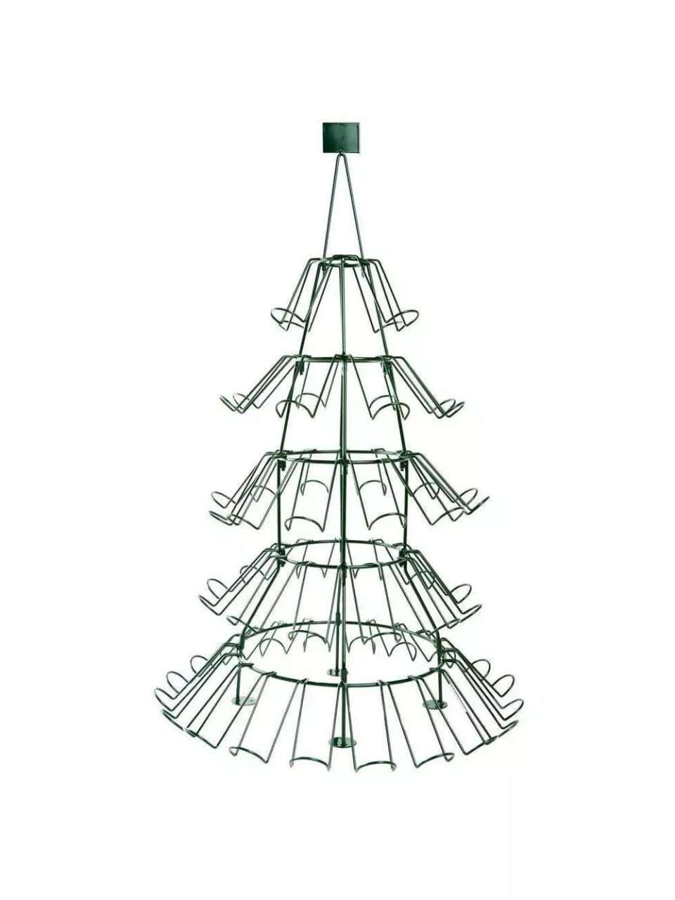 This unique, Christmas tree-shaped wine rack holds up to 60 wine bottles. The display is made of steel wiring with a lovely, dark-green coat of paint. Use to decorate your kitchen at holiday parties or place prominently by the door as a shoe rack.