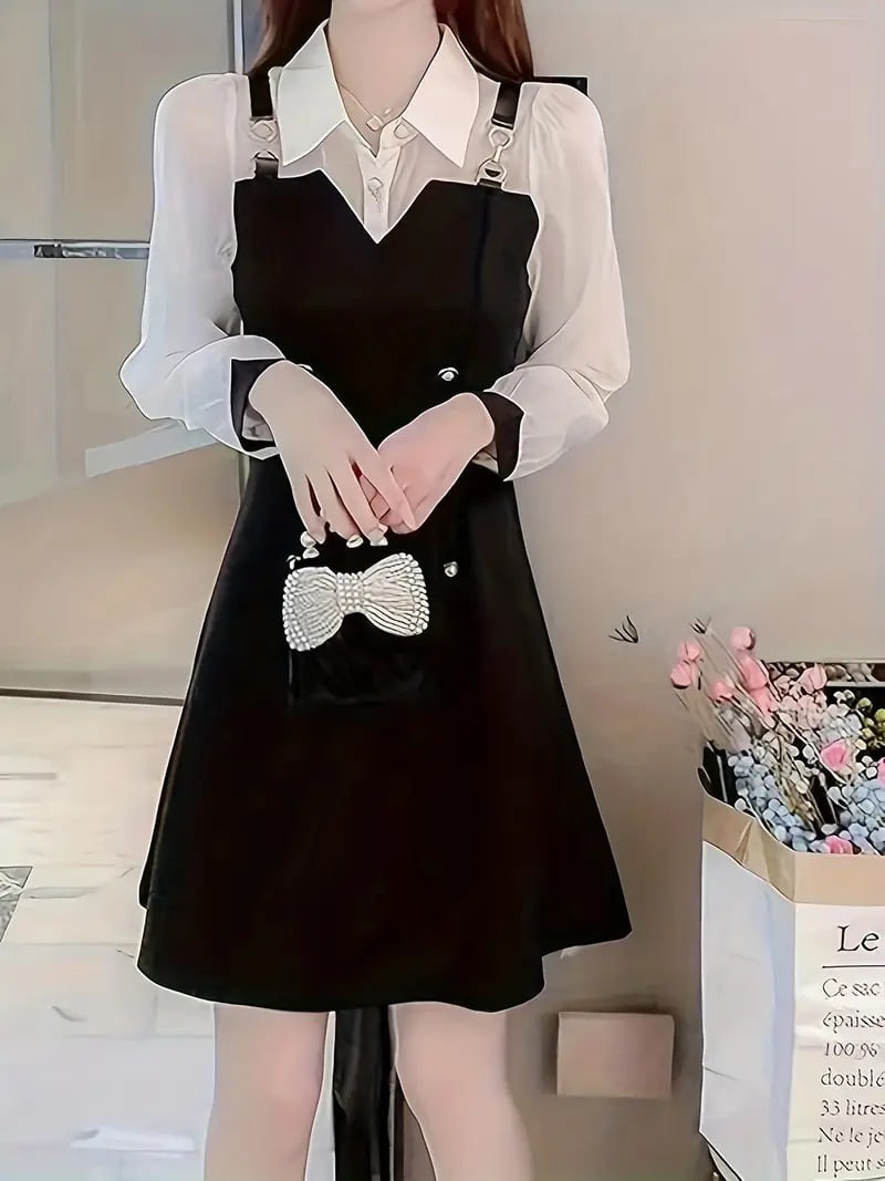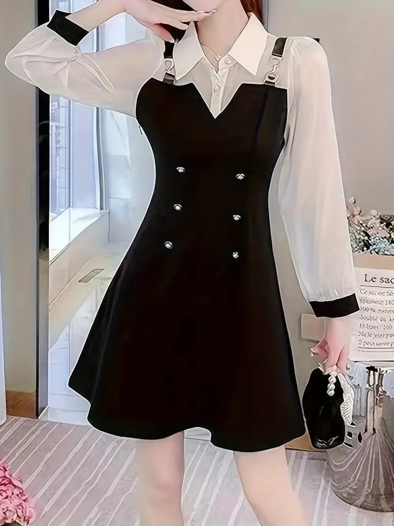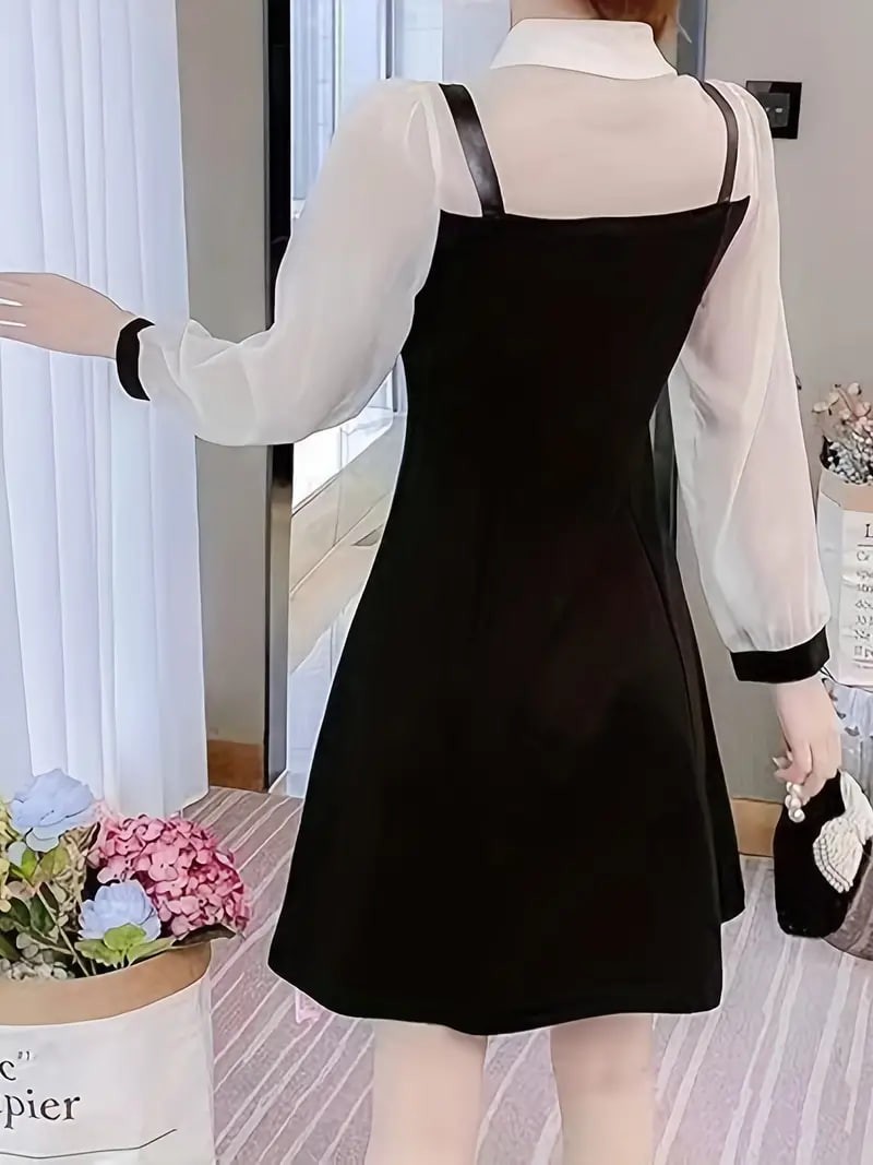 Color Block 2 In 1 Dress, Elegant Long Sleeve Chain Midi Dress, Women's Clothing