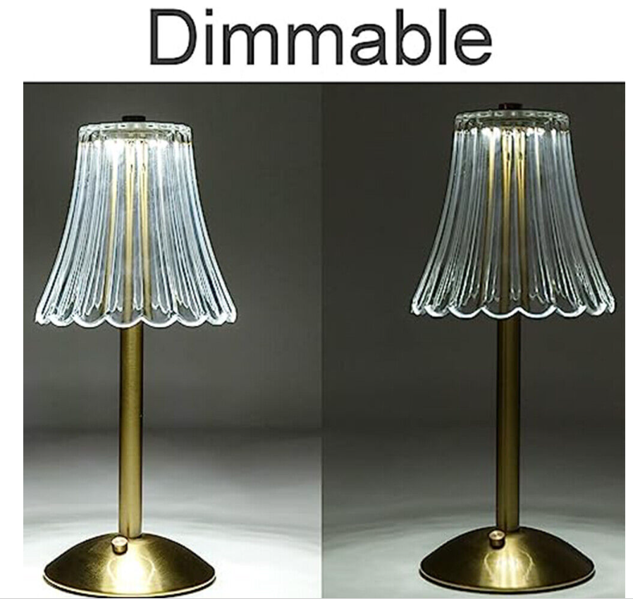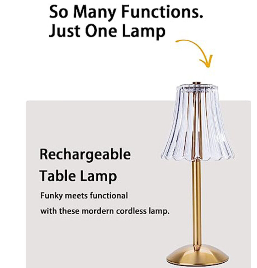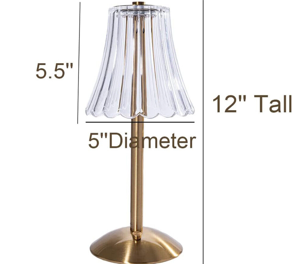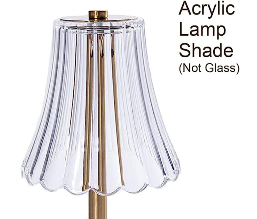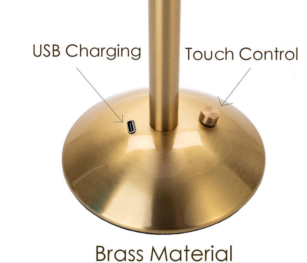Inspired by 1950‘s lamps and a mood lighting which is soft and warm. Table lamp with a sturdy brass gold base topped with a white sturdy acrylic shade(not glass). 12'' Tall.USB charging,cordless table lamp can be take to anywhere you want.Such a lovely lamp to decor your coffee table,dining table,side table or outside patio.