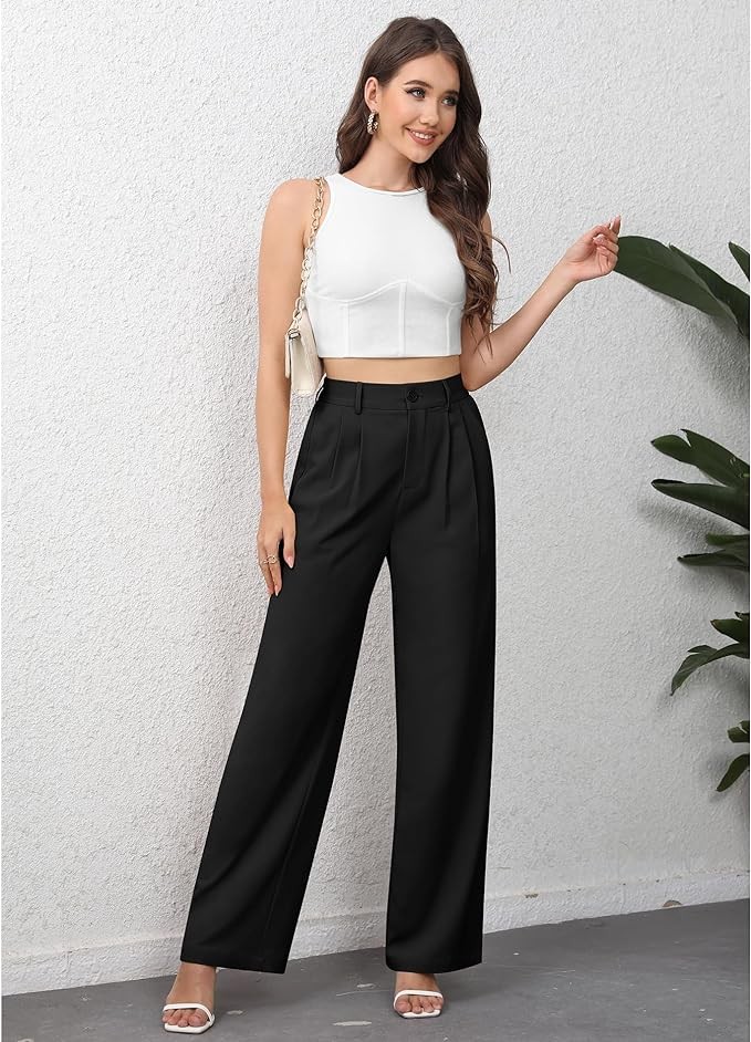 • Style: Suit pants, Wide leg pants, High waist work trousers, Elastic back design, Button and zipper in front, Business work pants, Loose fit, Casual style, Wide leg pants with pockets.