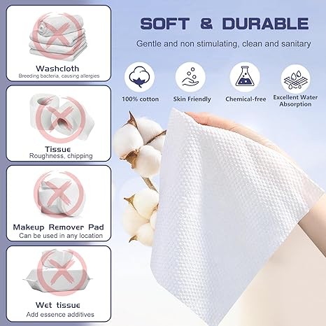 • 【Ultra Soft Disposable Face Towel】: Face towel 7.9" x 7.9" inches, face towels are softer, safer and thicker than other face cloths. The clean towels excellent water absorption and breathability, making you feel more comfortable when washing your face. facial wipes are designed with a two-sided texture, one side is smooth surface for wiping skin gently, and the other side is pearl texture surface to increase friction for deep cleansing