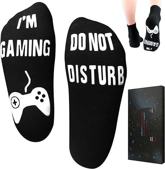 • 【Funny Novelty Gamer Socks For Boy Gifts】Do not disturb i'm gaming socks,Novelty socks is Anti-slip,with non skid rubber and funny words printed on each sock. Beware use caution when handling the socks if you have a latex allergy. Gaming socks are Machine Washable,hand washable with similar colors. Fathers Day Gifts gifts for dad who wants nothing,gamer gifts, anniversary gifts gift for boyfriend,funny socks for men,stocking stuffers for men.