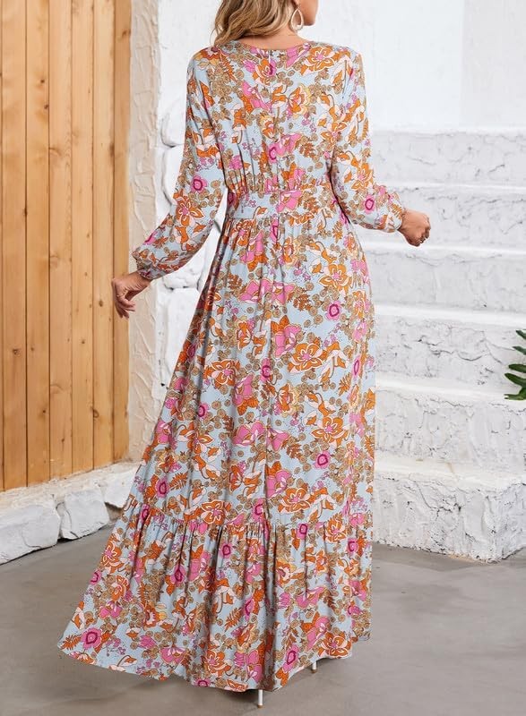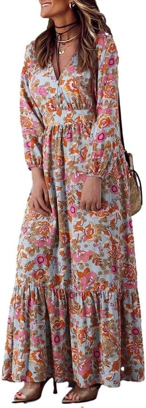 Dokotoo Women's 2024 Boho Maxi Dress Casual Long Puff Sleeve V Neck Ruffle A Line Flowy Casual Beach Dresses