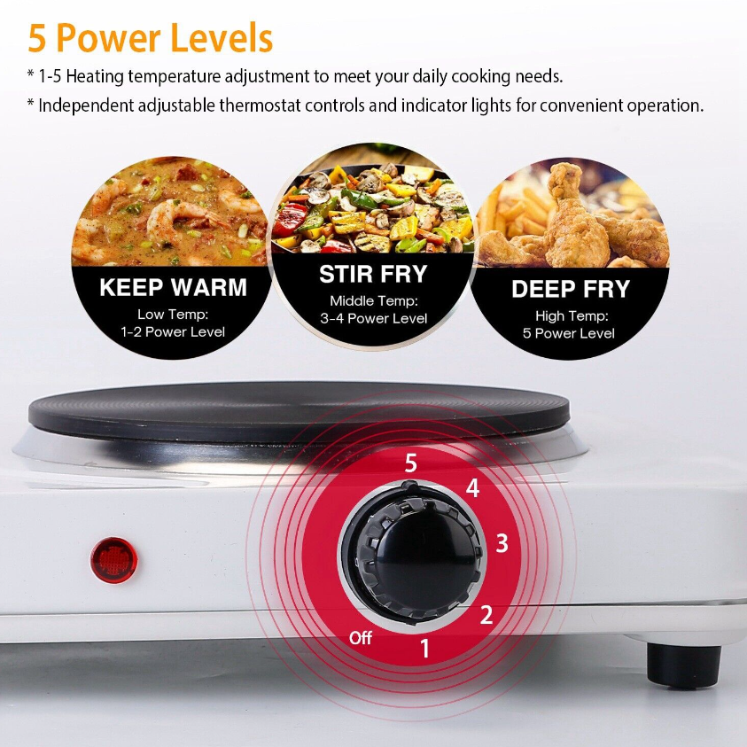 - 5 Power Levels:With 1-5 heating temperature adjustment,easily meet your daily cooking needs,such as boiling water,reheating sauces,making soups,frying steak,cooking pasta,grilling cheese and vegetables,etc.. Independent adjustable thermostat controls and indicator lights for convenient operation.