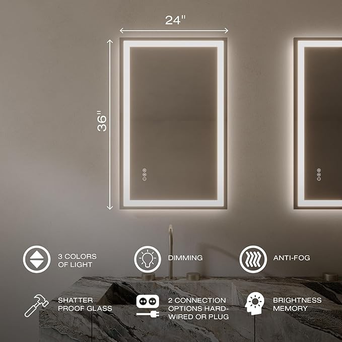 • [Versatile Placement] With dimensions of 24x36 inches, this LED mirror for bathroom is the perfect size to enhance any walland its versatile design of mirror vanity allows you to place it vertically or horizontally with Tempered Glass, Anti-Fog & Smart Touch Button