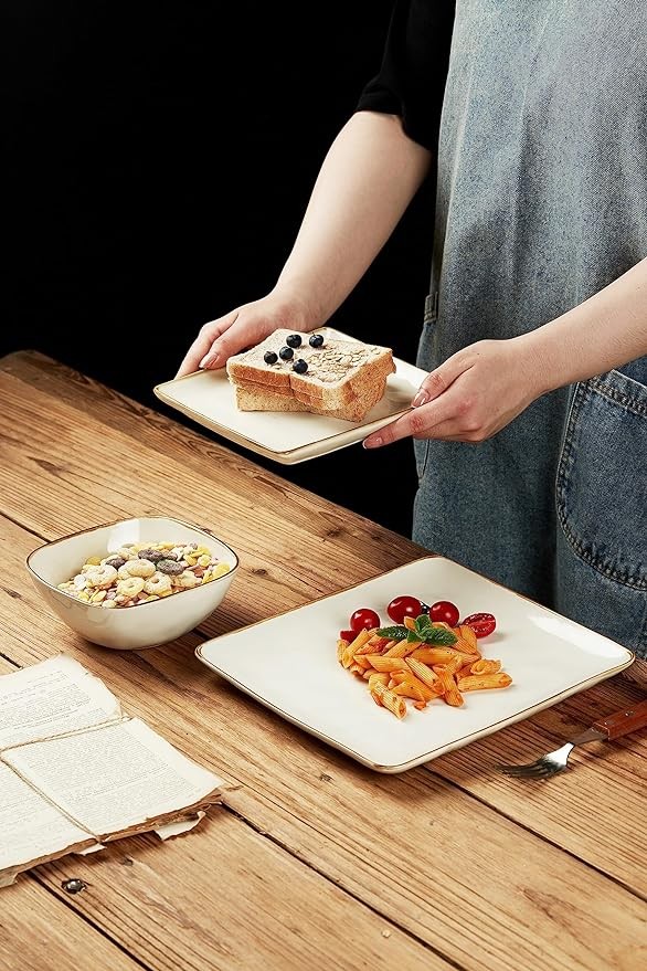 • 【12-Piece Dinnerware Set】This dish sets service for 4 that includes 4 large square 9.75 inch dinner plates, 4*7.25 inch salad plates and 4*6 inch cereal bowls. This kitchen plates and bowls set meet the need of your family perfectly.