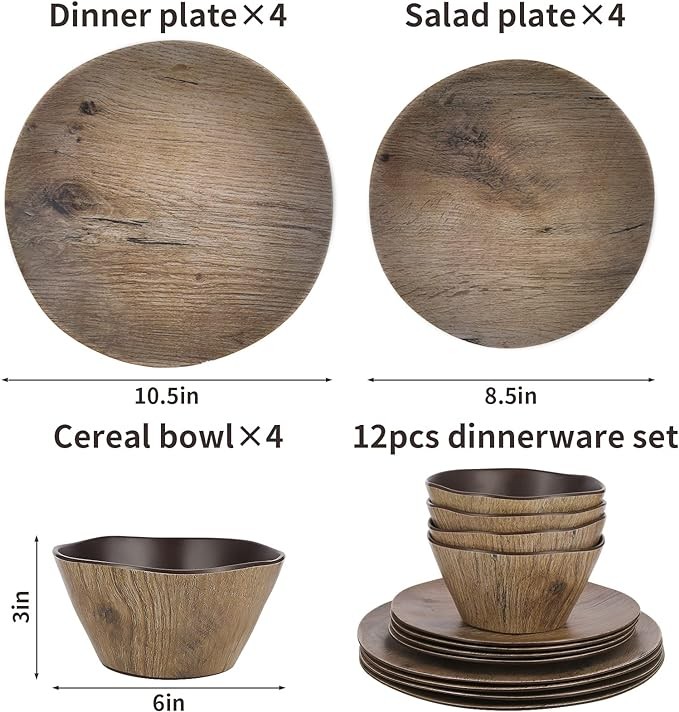 • SERVICE FOR 4: Complete 12 piece melamine dinner set for 4; 4 pcs large 10.5" dinner plates, 4 pcs 8.5" salad or dessert plates, & 4pcs 6" wide x 3" high soup/cereal bowls. Consider complimenting our rustic melamine plastic plates and bowls set dishes with our polished hand-forged flatware. A beautiful addition to your rustic farmhouse kitchen decor and home decor.