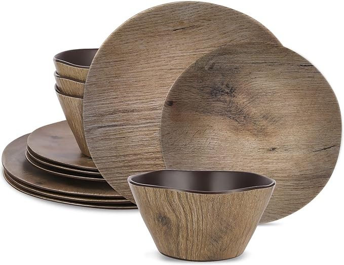 FELOVUWON Melamine Dinnerware Set 12pcs Dinner Plates and Bowls Sets for 4 Dishwasher Safe Camping Dishes Set Unbreakable Salad Plates for Casual Indoor Outdoor Dining Party RV Camping (Wood Grain)