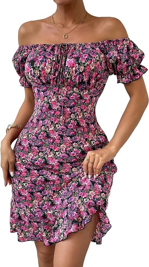 Floerns Women's Floral Summer Dress Tie Front Off Shoulder Short Sleeve Dress