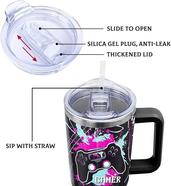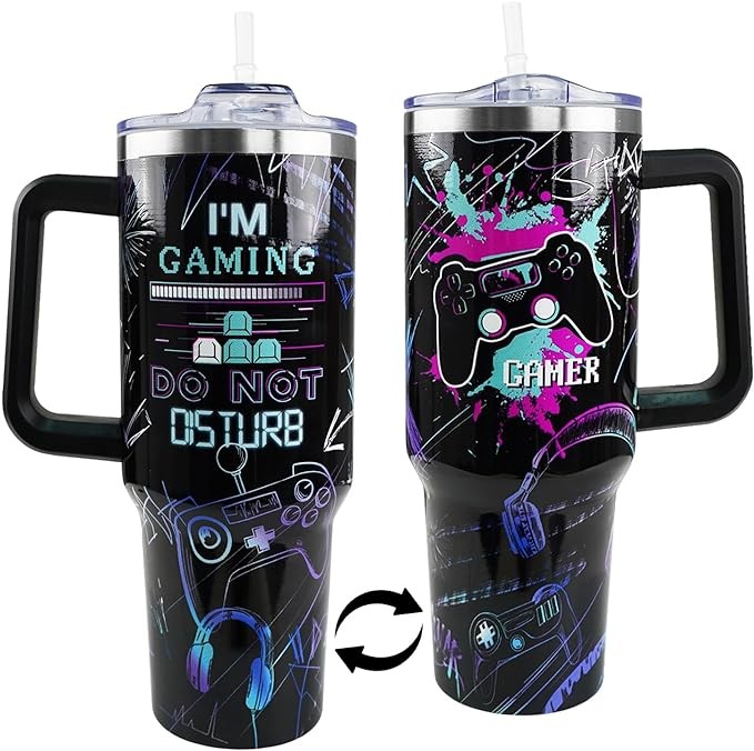 40 Oz Tumbler with Handle and Straw: The 40 ounce tumbler with handle has a large 40oz capacity helps you hold more water at once, and is easy to hold. The lower narrowing design of this gamer coffee travel cup tumbler fits most cup holders. These gamer cups are suitable for everyday use, coffee/tea on the go, indoor and outdoor events, travel, parties, camping, Etc.