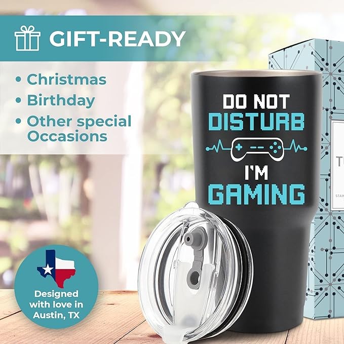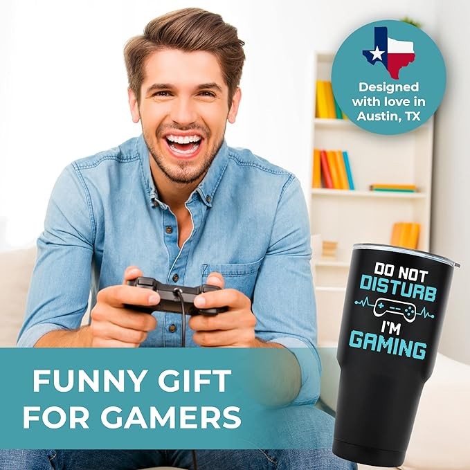?Funny Design: Designed with love in Austin, TX, this tumbler will make your loved one smile with its funny design! It has a high-quality print that says "Do not disturb, I'm gaming." This tumbler is also designed to be spill-proof so your loved one can carry it anywhere, whether at home, office, or during traveling. Great gaming gifts for teen boys, gifts for gamers men & gaming gifts for him!