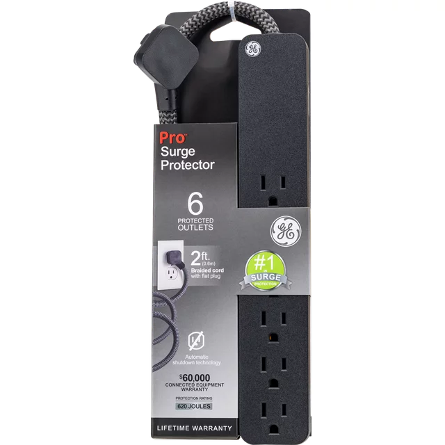 Style meets functionality with the GE Pro Black 6-Outlet Surge Protector. With six grounded outlets and a 2ft. extension cord, power your electronics from a distance. The braided fabric cord reduces tangles, while the low-profile flat plug saves space. The integrated circuit breaker cuts off electricity if it exceeds the maximum amperage, and automatic shutdown technology protects against expired surge protection. With 620 Joules of built-in surge protection, your equipment stays safe. Choose the GE Pro Black 6-Outlet Surge Protector for a stylish and reliable design.
