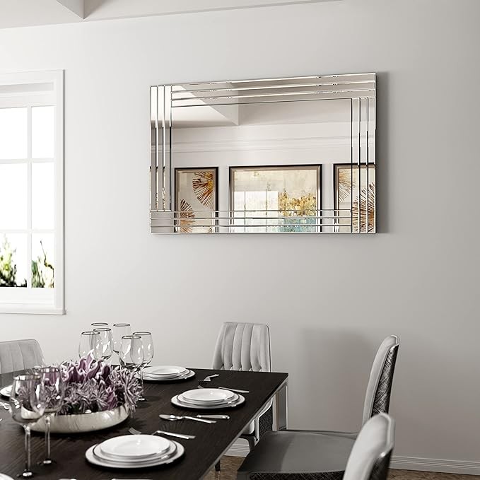 Modern and unique mirror wall decor with glass frame creates gorgeous and classic look. Well made design surface increases stereoscopic and sense of reality. Our solid wood backing design reinforce the product, which is more safety and stable than others.