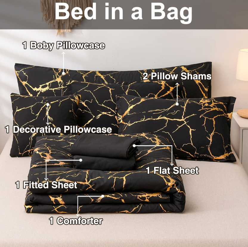 • King Bed in A Bag Comforter Set (7 pieces): : 1pc colorful gold marble comforter (90"x102"/228x260cm); 2pcs pillowcase(20"x36"/50x91cm), flat sheet(102"x104"/259x266cm), fitted sheet(80"x78"+14"/203x198cm+35cm), body pillowcase (20"x54"/50x137cm), decorative pillowcase ( 18"x18"/46x46cm)