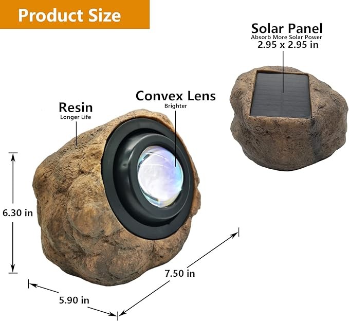 【Large Solar Panel and Big Volume Battery 】Rock solar garden lights come with advanced solar panel, measured size 2.95x2.95IN. Working time up to 8 hours at night when it is full charge. The solar panel absorbs the sunlight and converts it to energy, then saves it into an built-in AA1000 mAh battery.Please make sure the solar panel expose to direct sunshine at least 6-8 hour. The outdoor spot lights auto charged by solar powered,no electricity bill,savings money and eco-friendly to your life.