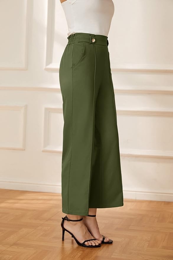 • DRESSY DESIGN: 2024 Cropped wide leg slacks are designed with high rise and elastic back waistline, which can contours your curves better, functional pockets are ideal for keeping your cards, keys or phone. Flat front, non-functional button, hidden zip at left side, with open side-entry pockets and belt loops, which is professional for work, interview and any other formal occasions, it's also comfortable for daily activities, like yoga, golf, lounge, date, etc.