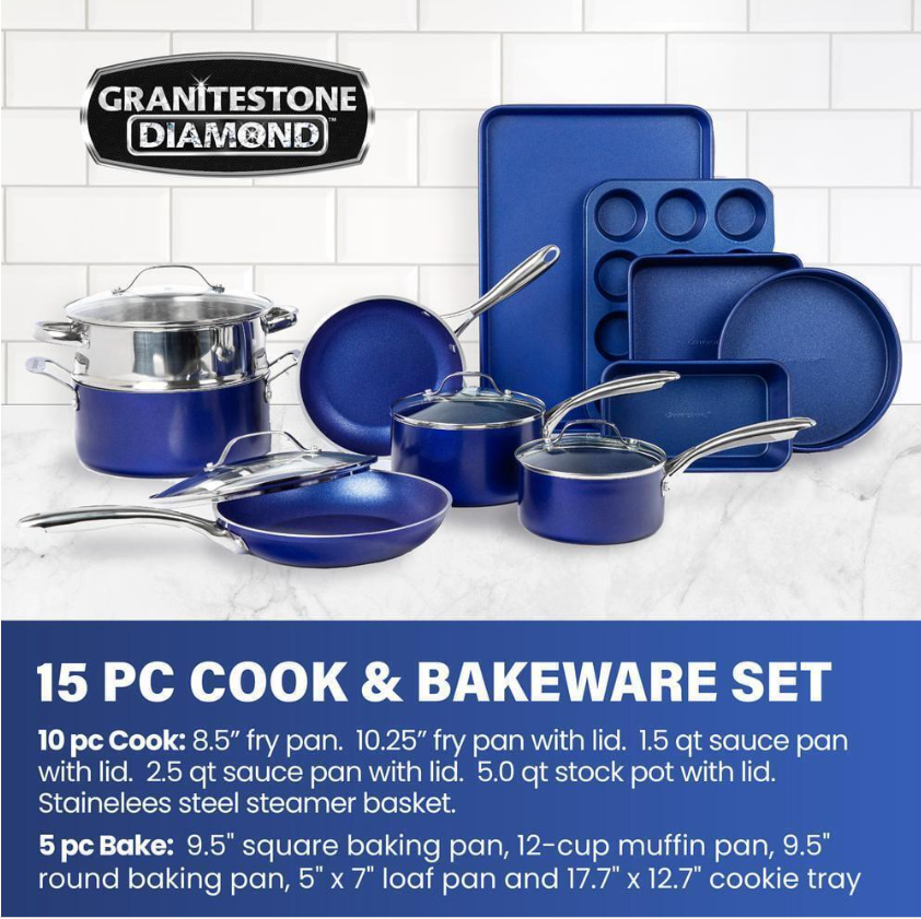 Cook like a pro with this Granitestone 15-piece cookware and bakeware set. Solid aluminum construction ensures even heat distribution. For safe use in the oven, it endures temperatures up to 500 degrees F. The stay-cool stainless steel handles let you move your cookware with comfort. Built to last, it features an extra-thick coating with diamond infusion.