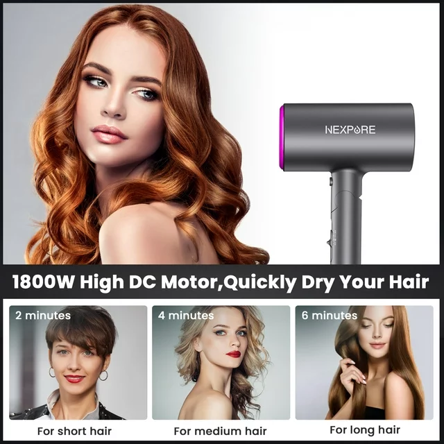 Hair Dryer, NEXPURE 1800W Professional Ionic Hairdryer for Hair Care, Powerful Hot/Cool Wind Blow Dryer, 3 Magnetic Attachments, ETL, UL and ALCI Safety Plug (Dark Grey)