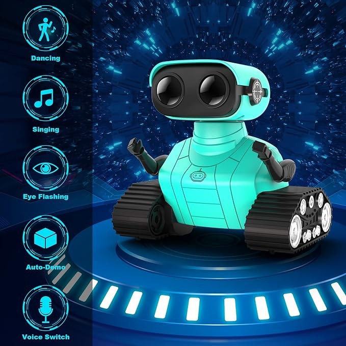 • Multifunctional Robot: LED eyes can light up once you turn on the robot, you can also make it blink or closed by the controller. Smart Voice - turn on the robot it will start talking, he can also sing different songs which can be switched by remote; the track of the tank allows the robot to move forward backward left, and right flexibly. Under demo mode, it will begin 360-degree spins, dancing with flexible arms and heads.