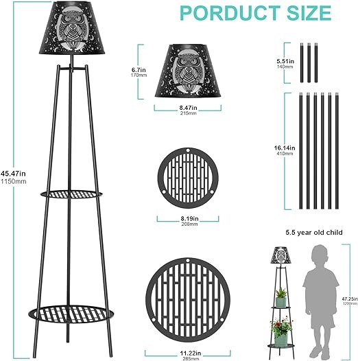 • INNOVATIVE SOLAR STREET LIGHT: This solar street light gets rid of the monotony of the traditional street light, the lampshade part of the lampshade is so cute with the owl carved by the hollowing out technique. The structure of the lamp body adopts a triangular structure, and there are two plant shelves underneath. You can put flower pots or some other garden statues on the shelves to enrich the decoration of the terrace garden patio.